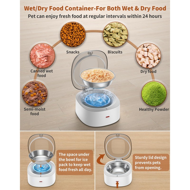 - Cool it, Keep It Fresh - For the wet food, our automatic cat feeder comes with 3 Ice Packs, which keep food fresh and make food last longer. The ice packs effect 6-8 hours. You can freeze the food before putting it in the feeder. For the dry food, our patent rotor in the removbable tank base and top-lock lid prevent pets sneaking into the feeder for extra food. The desiccant bag and sealing strip keep food fresh and crunchy. The tank lid, tank, tank base, and stainless steel food bowl are removable for easy cleaning. Food-grade stainless steel bowl provides healthy and hygienic feeding, saving your pets from chin acne.