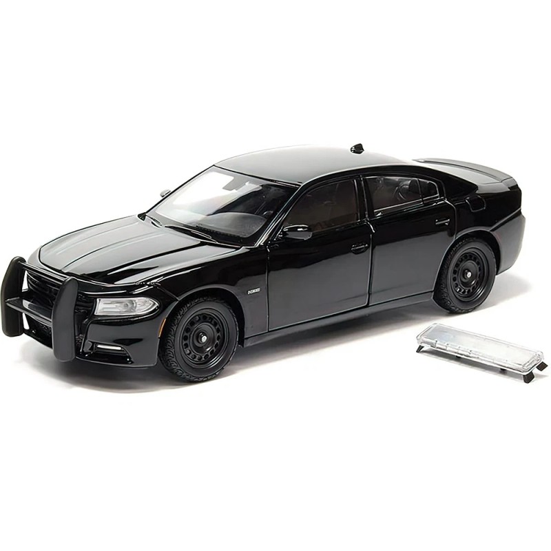Welly's 1:24 scale 2016 Dodge Charger R/T Police Pursuit rolls in plain black with a menacing presence and detailed muscle under the hood. Featuring opening doors and hood a finely crafted HEMI V-8 engine and interior police detailing this model is ready for duty. Steelie wheels and a separate light bar (assembly required) add to its authentic patrol-ready stance making it a must-have for law enforcement collectors.