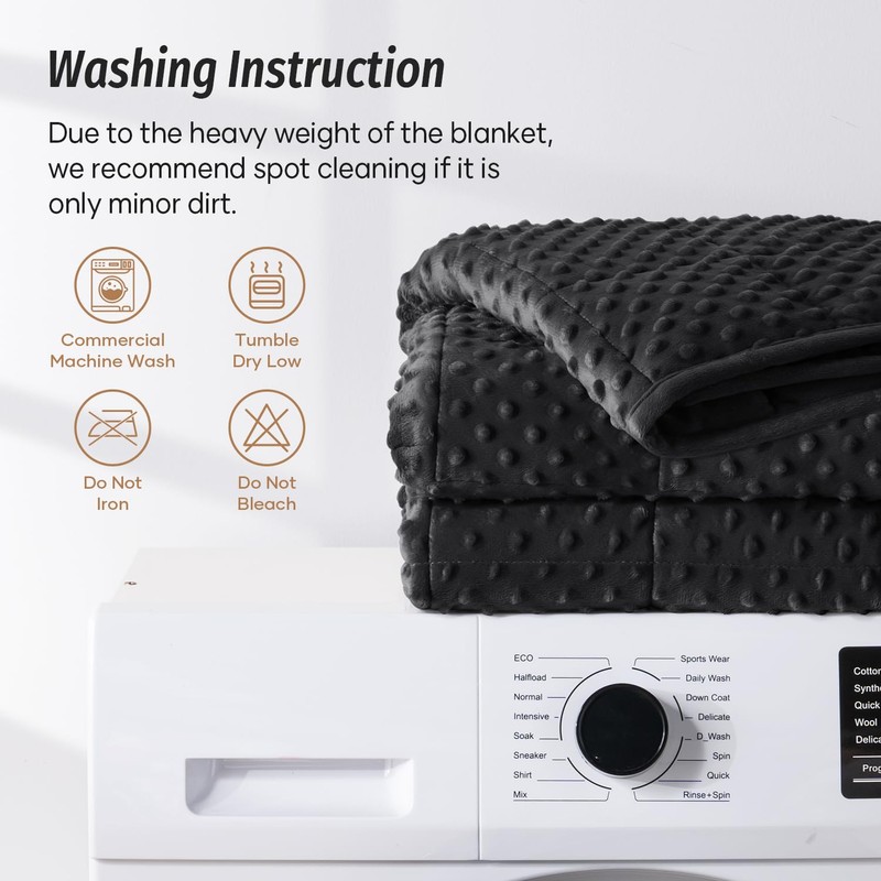 - Washing Instruction: Our weighted blankets are designed for durability and wrinkle resistance, no pilling, fading, or shrinking. We recommend washing in a commercial machine and tumble drying on a low temperature, blankets should not be bleached or ironed, if only lightly soiled we recommend spot cleaning