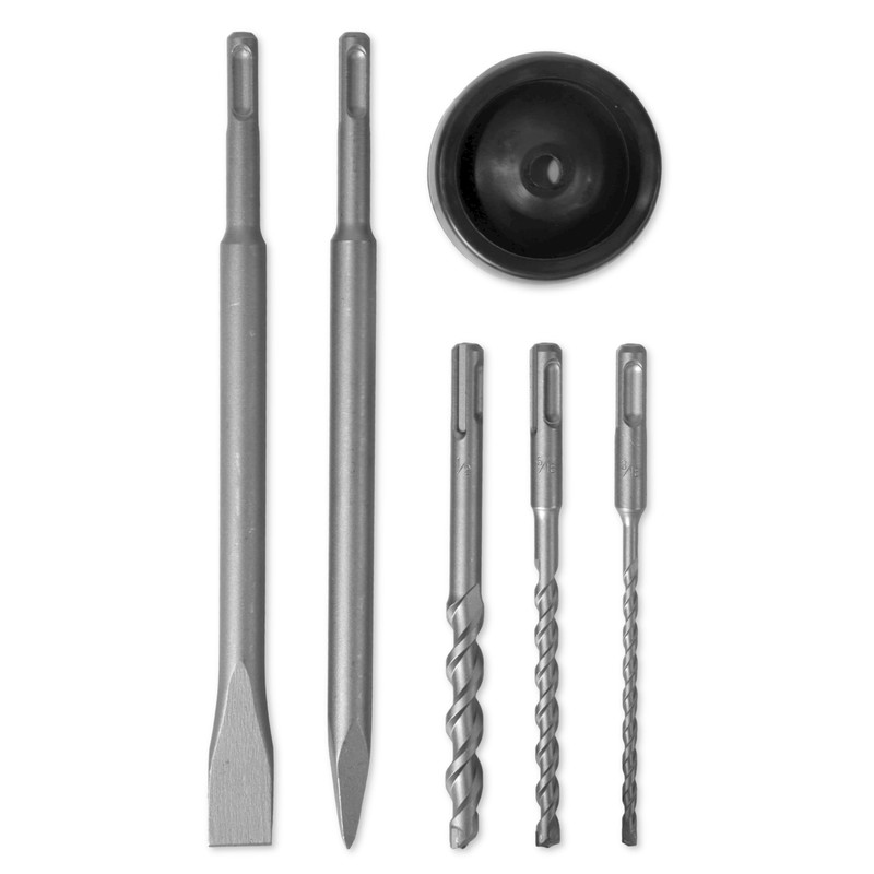 - Includes an adjustable 360-degree auxiliary side handle, three drill bits (3/16, 5/16, and 1/2-inch diameters), two chisel bits (one flat 9/16-inch bit and one pointed bit), a hard-shelled carrying case, and a two-year warranty