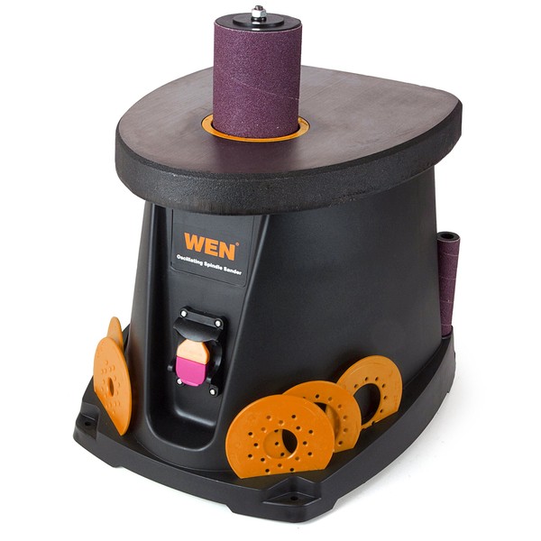 Remember when you used to have to sand those rounded edges by hand? With the WEN oscillating spindle sander you'll never have to face that problem again. This is the ultimate sanding tool for quickly and easily smoothing out arcs, curves, contours and odd shapes. The plates and drums are easy to swap in and out and the lightweight design allows for easy mobility if need be. However, just because the compact design weighs in at a mere 30 pounds does not mean that we've sacrificed power. The WEN oscillating spindle sander features a smooth and quiet 1/2HP 3.5 amp motor while the sanding spindle moves up to 58 oscillations and 2000 rotations per minute with a 5/8 inch stroke. Our package includes six sanding sleeve attachment sizes (1/2, 3/4, 1, 1-1/2, 2 and 3 inches) and five rubber Drums to allow for a full range of curves to match whatever the situation calls for. Meanwhile, the onboard storage keeps the spindles, sleeves, Table inserts and Spindle washers organized and accessible for Quick changes. The dust port provides the option to attach dust extractor to collect the airborne dust particles, ensuring a cleaner working surface and shop so you can keep building. And because it's a WEN product, Our oscillating spindle sander is also backed by a two-year warranty, a friendly and knowledgeable customer service hotline and a national network of experienced service technicians. It's time to make any difficult sanding task a breeze, allowing for maximum creativity with any woodworking project. Remember when you could easily sand any curve or edge your heart desired? Remember WEN.