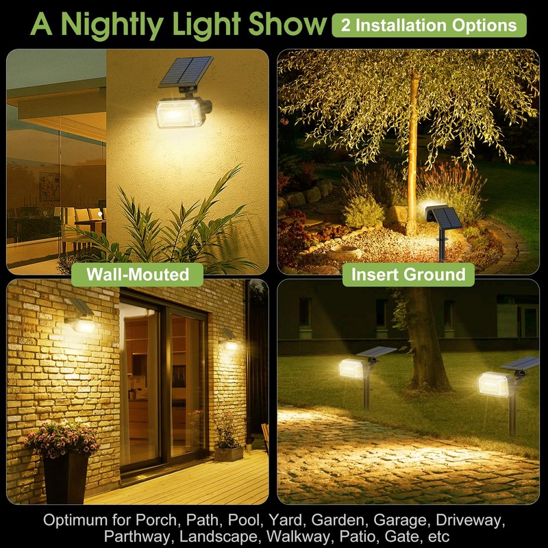 - 【2-in-1 Installation】Choose the installation method that suits your needs. The solar spotlight with a detachable stake into the ground for a seamless integration with your lawn, garden, or pathway. Alternatively, use the provided screws to mount the solar yard lights securely on walls with adaptable angles, enhancing the aesthetics and illumination of your outdoor spaces from a new perspective. Suitable for various outdoor settings, like trees, flag poles, porches, decks, garages, driveways, pool and courtyards
