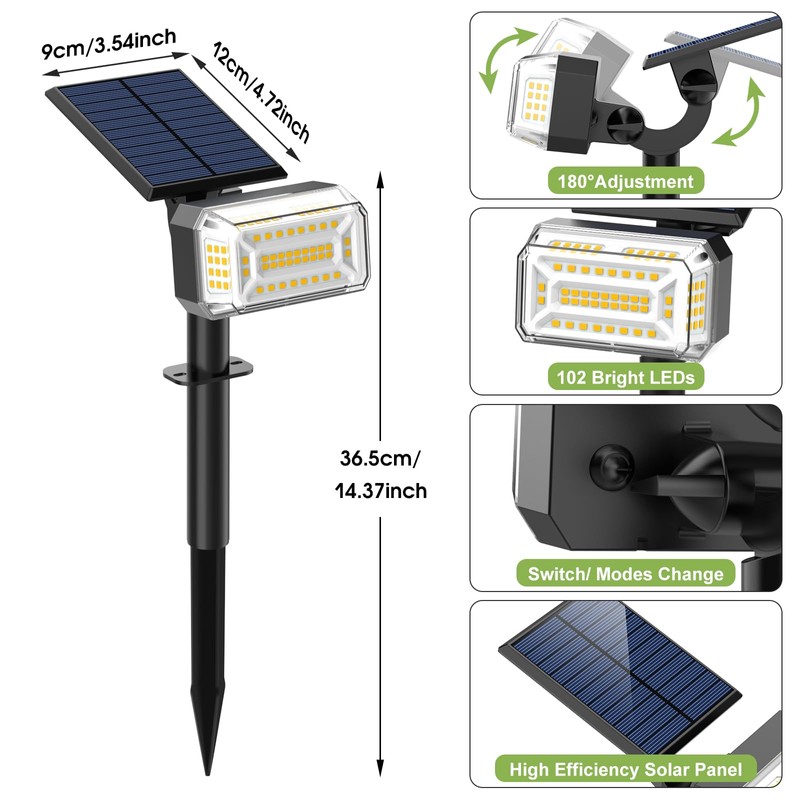 - 【102 LEDs Super Bright Solar Landscape Lights】The new outdoor solar lights for yard are equipped with 102 LED, Illuminating your entire backyard all night long! The five-sided design provides 270° lighting, giving the solar garden lights a wider range beam and a longer illumination distance that will illuminate your entire house, fence, and patio! Make you fully appreciate the effect of lighting up your outdoor yard, pool, or even garden landscape at night