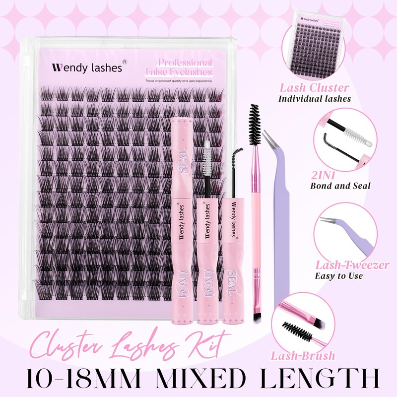 WENDY DIY D Curl Lash Clusters Individual Cluster Lashes Kit 10-18 mixed Wispy Lashes-kit Soft Set with 2 in 1 Lash Bond and Seal,Eyelash tweezers(YM15-07-D-1018-Kit)