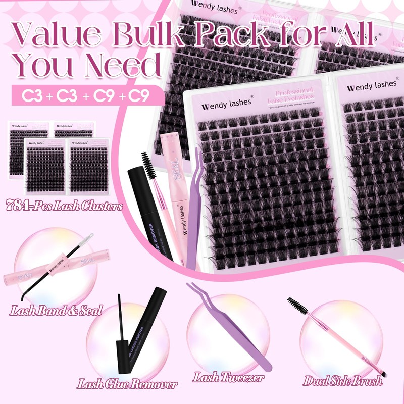 Wendy Lash Clusters Kit Packs: 784Pcs Individual Eyelashes for DIY Lash Extensions Kit, D Curl, 10-18mm Mixed Eyelash Clusters,Cat Eye, Soft, Volume, Fluffy,Bulk Pack(C3/C3/C9/C9)