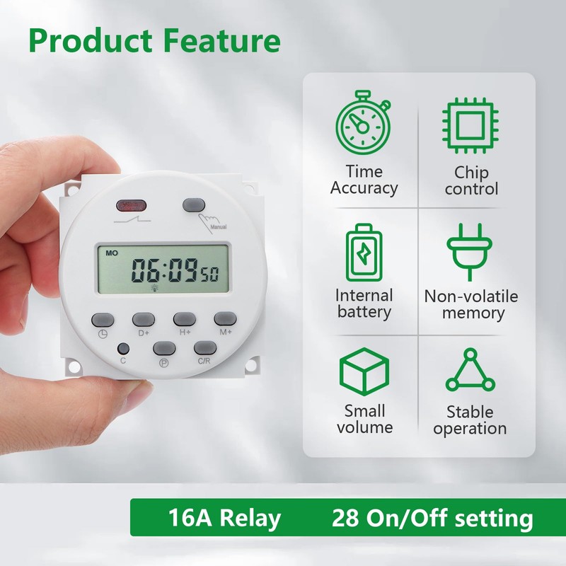 - This timer switch supports a variety of time modes, including 28 on/off programs per day, 15 combinations, manual and automatic modes to meet your needs in different scenarios. Whether it is to automatically turn on the coffee machine in the morning to prepare breakfast, or turn off lights and electrical appliances at night, this is easy and brings great convenience to your life.