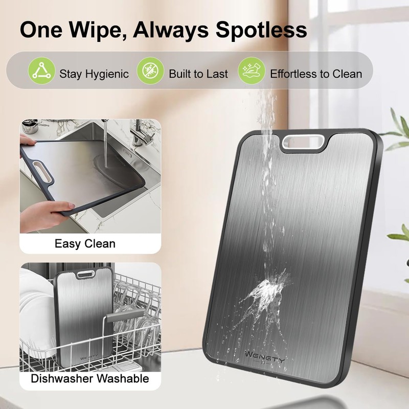 - 【Uncompromising Quality & Durability】 Engineered to outperform traditional cutting boards, our premium titanium surface resists knife marks, repels food residue, and never absorbs odors – ensuring lasting hygiene. The solid titanium construction features a thickened design that withstands rigorous daily use, from heavy chopping to precise slicing, without scratching or retaining food juices. This combination of innovative materials and robust engineering creates the ultimate long-term kitchen investment