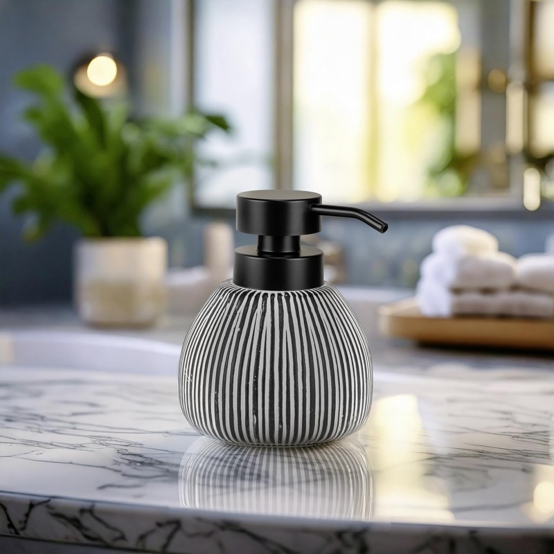 WENKO Pascoli Soap Dispenser Elegant Freestanding Ceramic Dispenser for Bathroom 0.5 L Black and White Textured 11 x 13 x 12 cm Ceramic Plastic