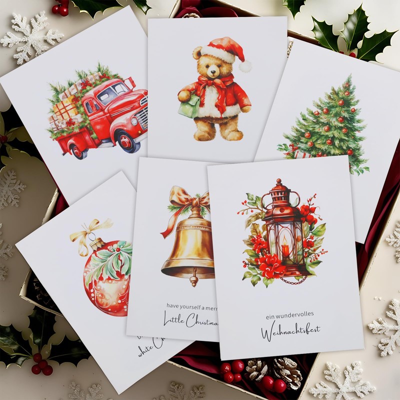 - [Ours is different] Unlike the usual English Christmas card sets, our Christmas card set is designed in both English and German (10 different greetings) and combined with a Christmas envelope sticker that accentuates the Christmas atmosphere to add heart and depth to your blessings