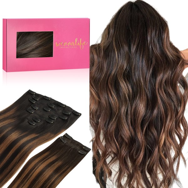 WENNALIFE Clip in Hair Extensions, 150g 18 Inch 9pcs Balayage Natural Black to Chestnut Brown Human Hair Extensions Thicker Clip in Hair Extensions Real Human Hair Clip Set Double Weft