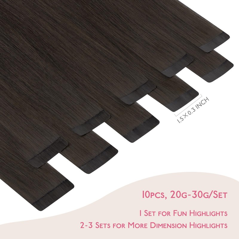 - Tape-in extensions real hair specification: tape extensions real hair made of real human hair: 4 cm wide, 10 pieces, 30 g per pack, available in 25-65 cm length. We recommend 3-4 packs to achieve fuller and thicker hair.