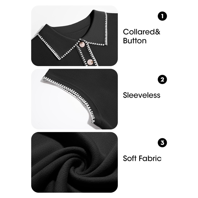 Wenrine Womens Sleeveless Mini Dress Casual Collared V Neck Contrast Stitch Loose Summer Knit Tank Dresses Black