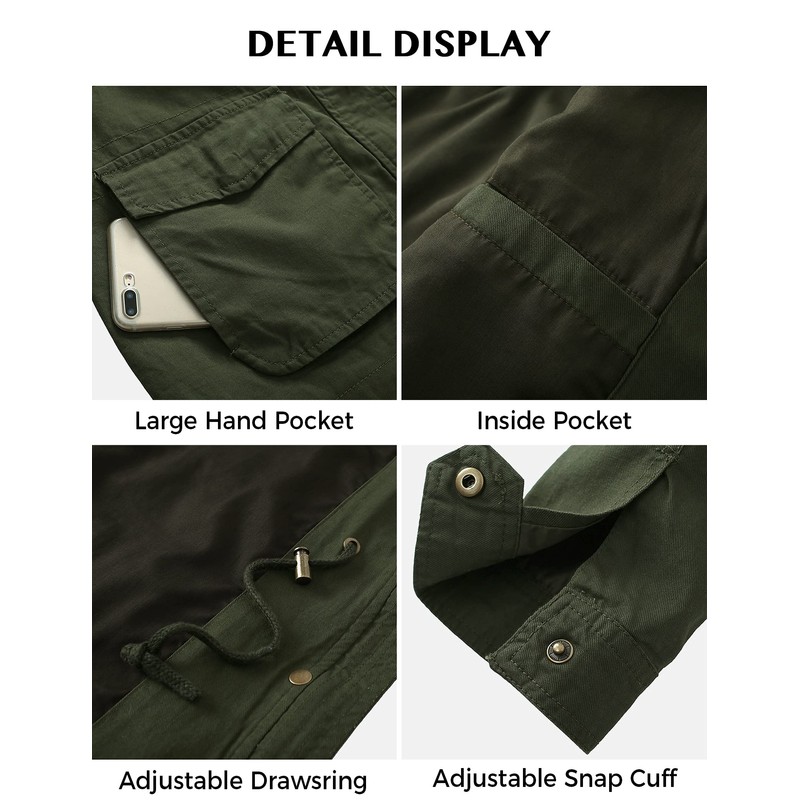 - Pair this lightweight army jacket with your favorite blue jeans or pants for a casual yet stylish look. You can also choose to detach or attach the hood for different styles.