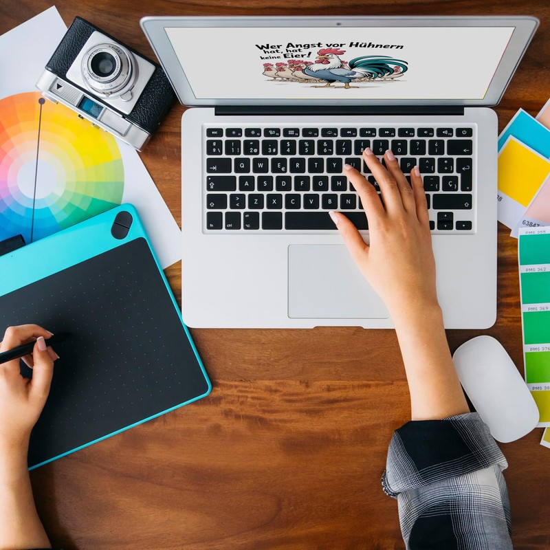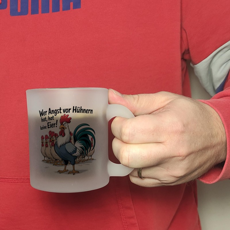 - Dieser Kaffeebecher zeigt einen prächtigen Hahn, der seine verängstigte Hühnerherde beschützt. Mit seiner bedrohlichen Pose und dem humorvollen Spruch Wer Angst vor Hühnern hat, hat keine Eier! zieht er alle Blicke auf sich. Der weiße Hintergrund hebt das lustige Design besonders hervor und sorgt für einen echten Hingucker.