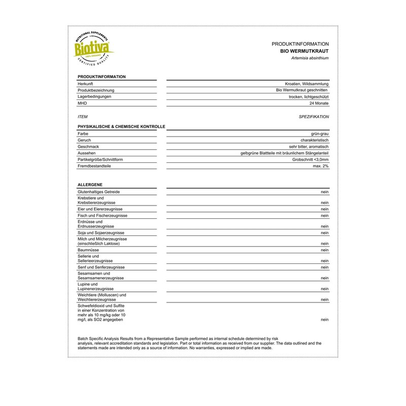- BIO WERMUTKRAUT beinhaltet 100% reinstes Wermutkraut aus Bio-Anbau. lat. Artemisia Absinthium. Ohne Zusatzstoffe. Nur Natur pur.