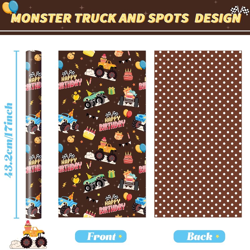 - REVERSIBLE DESIGN - The monster truck themed birthday wrapping paper roll features monster trucks, trophies and the wrods “Happy Birthday’’, the reverse side features white and brown polka dot patterns, making your gift more special. Perfect for monster truck theme birthday parties
