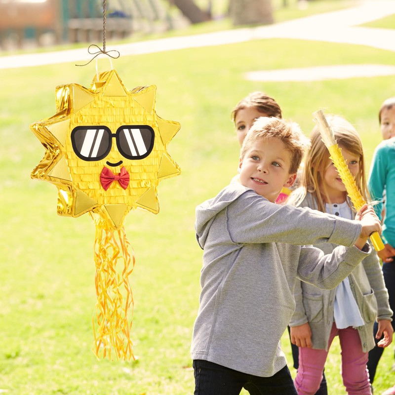 - 【SMILING SUN DECOR】- This cute sun pinata features a smiling face with a pink bow on one side and a smiling face with sunglasses and a tie on the other. Attract children's attention at your girl's birthday, baby party and summer party with party decorations that bring warmth and joy to you and your friends.