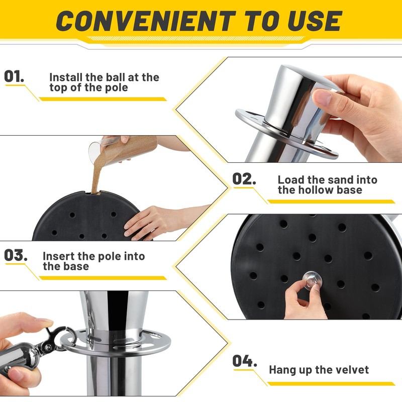 - Reliable Material for Durability: the crowd control stanchions and velvet ropes are made of quality materials for ensuring longevity; The stanchions are crafted from a blend of stainless steel and zinc alloy, robust and durable; The divider rope is made of velvet, adding a touch of elegance while ensuring firm crowd management