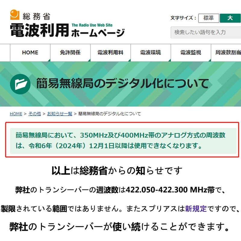 • For walkie talkie: 10 mW transmit output and specified low power transceiver frequencies between 422.050 - 422.300 MHz. The transceiver unit has a technical code for the Japanese Ministry of Consumer Technical Standards Standards Standards Standards and Technical Standards Compliance Number. Please use with confidence. :