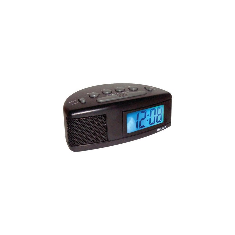 Named for its 90-decibel alarm, the Westclox Banshee digital alarm clock will rouse even the drowsiest sleeper when it sounds its morning siren. Designed with a forward-facing speaker, the alarm clock features two volume settings-- and even the "soft" setting will be plenty loud for most people. In addition to its hard-to-miss alarm, the clock features oversized numbers on a 1/2-inch LCD screen for quick reading. A blue backlight can be activated with a button for nighttime, and a snooze feature lets you catch a few more winks before getting up for good. The alarm clock is compact and portable, as its power source comes from one 9-volt and two AAA batteries instead of electricity. It measures 1-3/4 by 4-3/4 by 3 inches, compact enough even for small nightstands. _\--Emily Bedard_