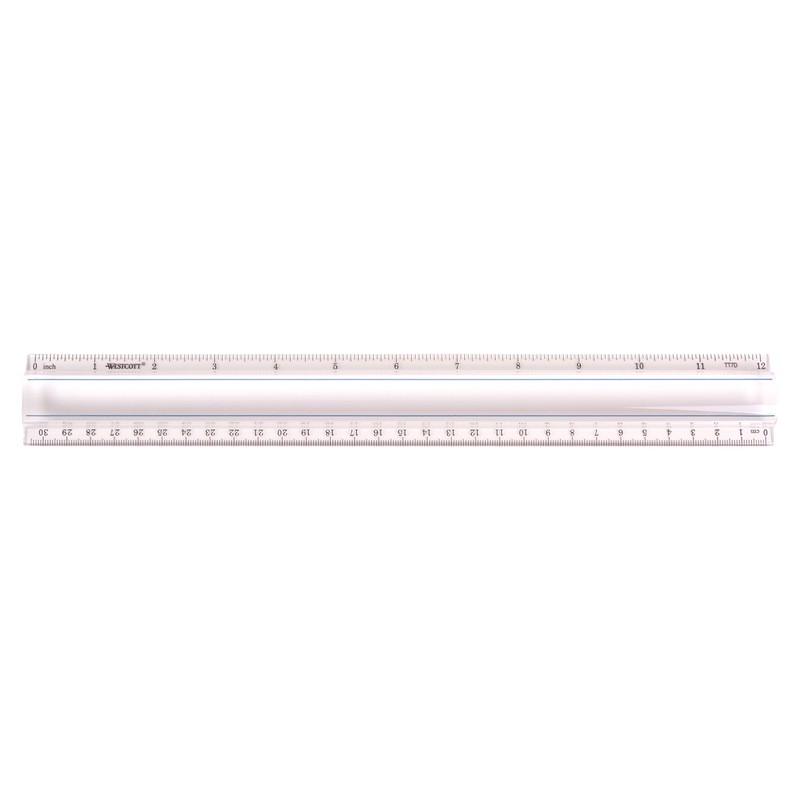 Westcott Magnifying Rulers center section magnifies one line at a time. 1 edge ruled in /16" scale, the other centimeters. Magnified portion ruled on side in 1/16", the other in tenths. Scales correlate with printout columns.