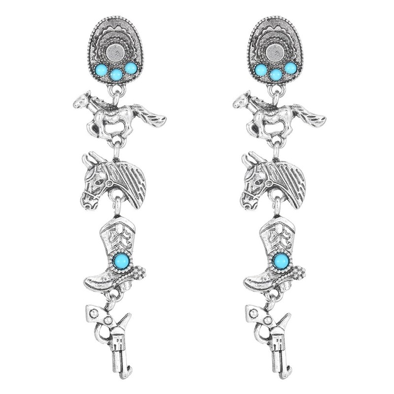 - 🌵🌵【Design】These retro western earrings use boots, hats, horses and other elements, and then decorated with turquoise as a decoration, the whole earrings appear retro elegant up. Can Be a good match with the clothes in your closet, let a person's eyes light up.