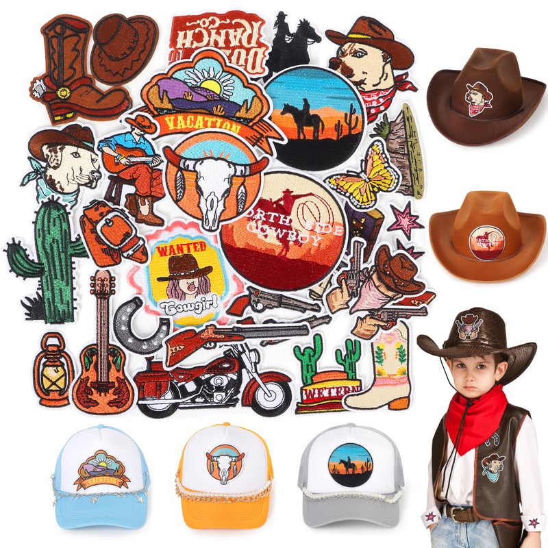 - Embroidered Patches Include: These 32pcs cool iron on patches are crafted with classic western cowboy and countryside elements.Each embroidered patch is unique and exquisite, such as cowboy hats, bull heads, guitars, mountains, cactus,cowboy riders, motorcycles, and more. With a variety of styles, these sew on patches are perfect for boys, teens, grown men, and cowboys.
