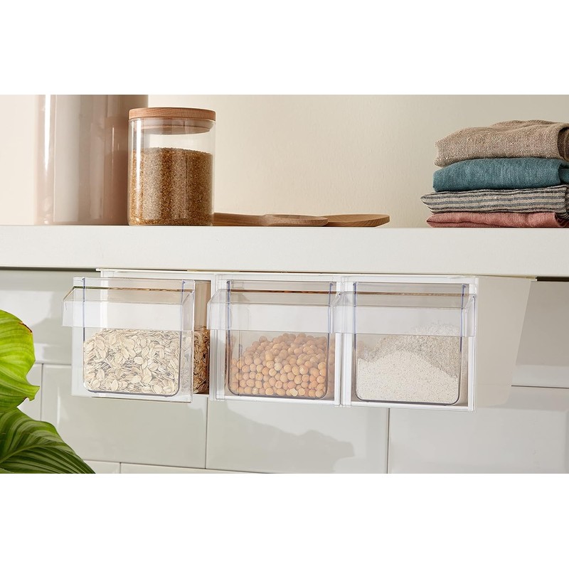 - Practical chute housing with 3 chutes, each with a capacity of 1 liter, for storing flour, sugar, breadcrumbs, spices, muesli or cornflakes, also suitable for storing craft supplies, screws or sewing accessories