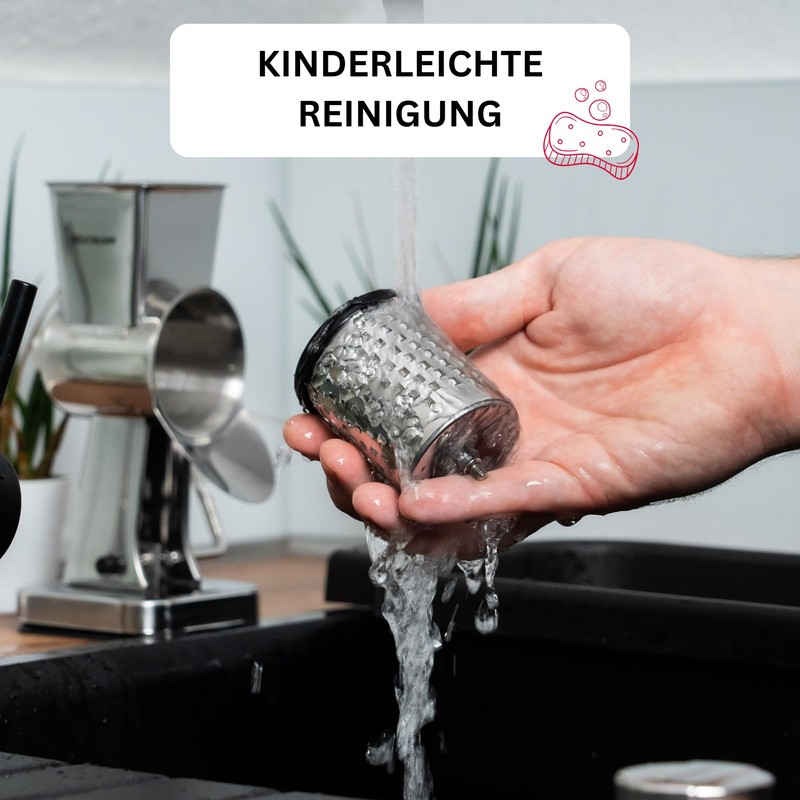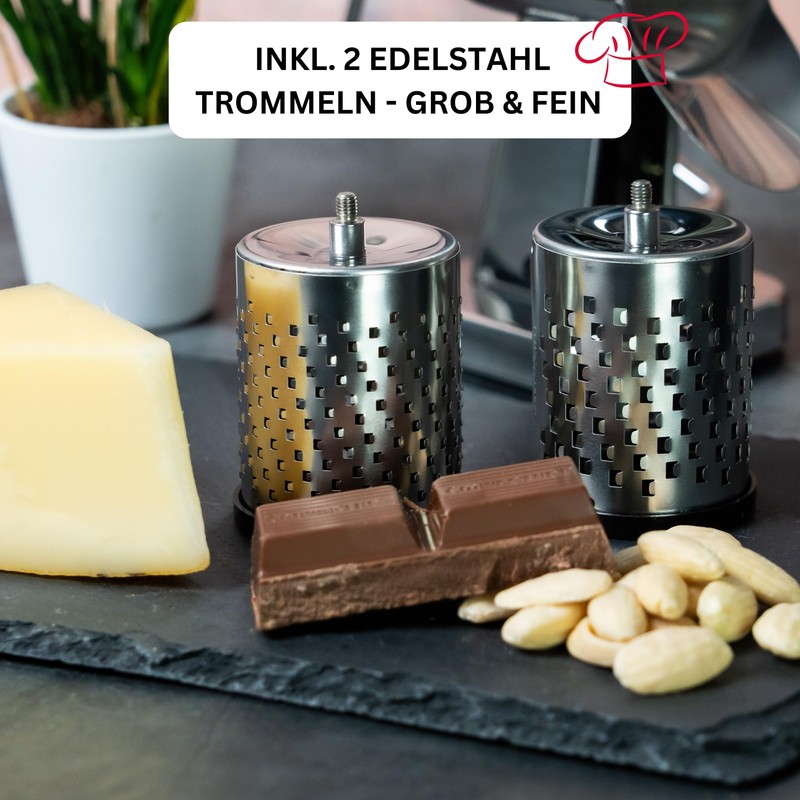 • For the fine grating of almonds, nuts, chocolate, hard cheese etc., with 2 grating drums made of rustproof stainless steel. Extremely sharp and durable grating drums due to the special production process.