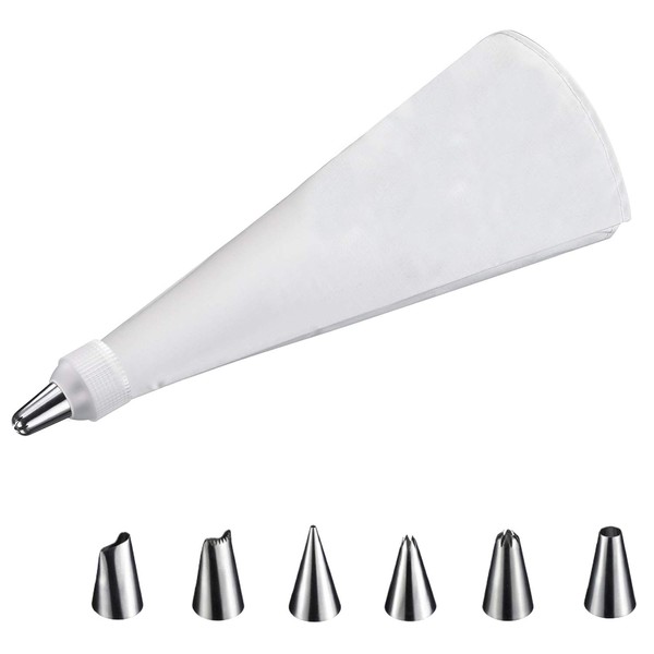 - Even garnishing and filling thanks to rust-proof stainless steel nozzles for any occasion: 2 star nozzles (diameter 5 mm, diameter 8 mm), 2 hole nozzles (diameter 1 mm, diameter 6 mm), filling spout (diameter 5 mm / length: 4.3 cm) and 2 edge/rose nozzles (1 cm), dressing bag made of coated, boil-proof cotton fabric