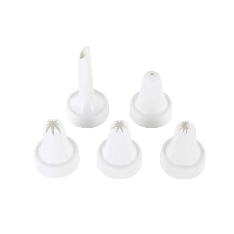- Even garnishing and filling of desserts with press stud, shaped nozzles for any occasion: 2 star nozzles (diameter 1/1.2 cm), hole nozzle (diameter 2 mm), decorating nozzle (diameter 1 cm) and a filling spout (diameter 5 mm / length: 4.3 cm)