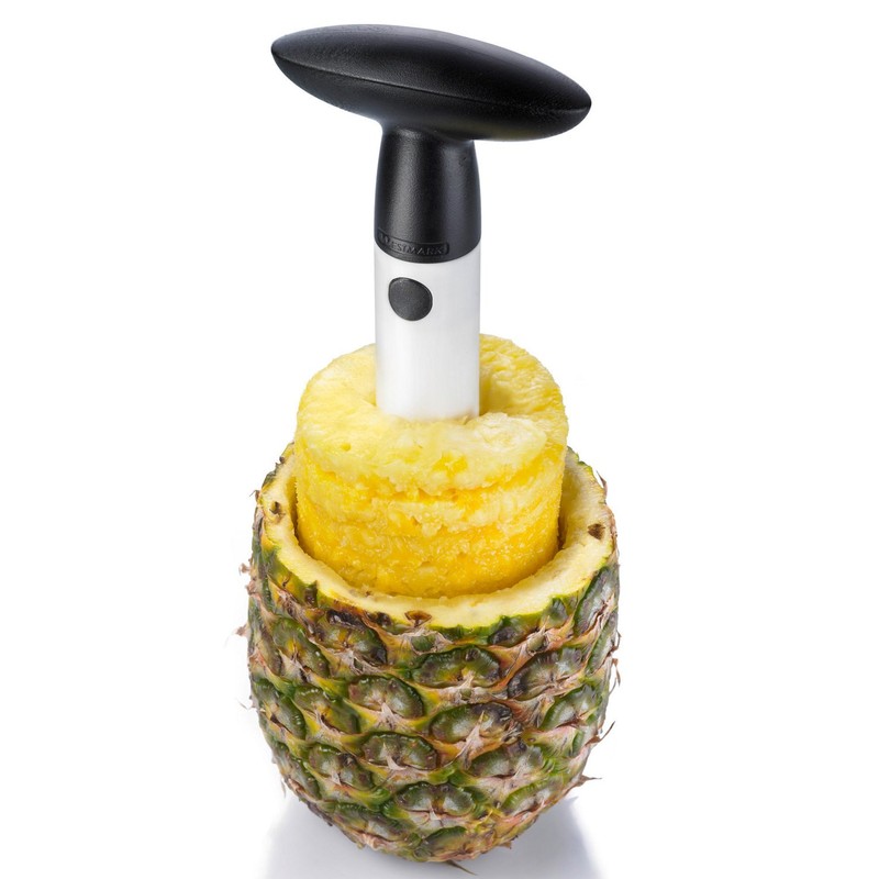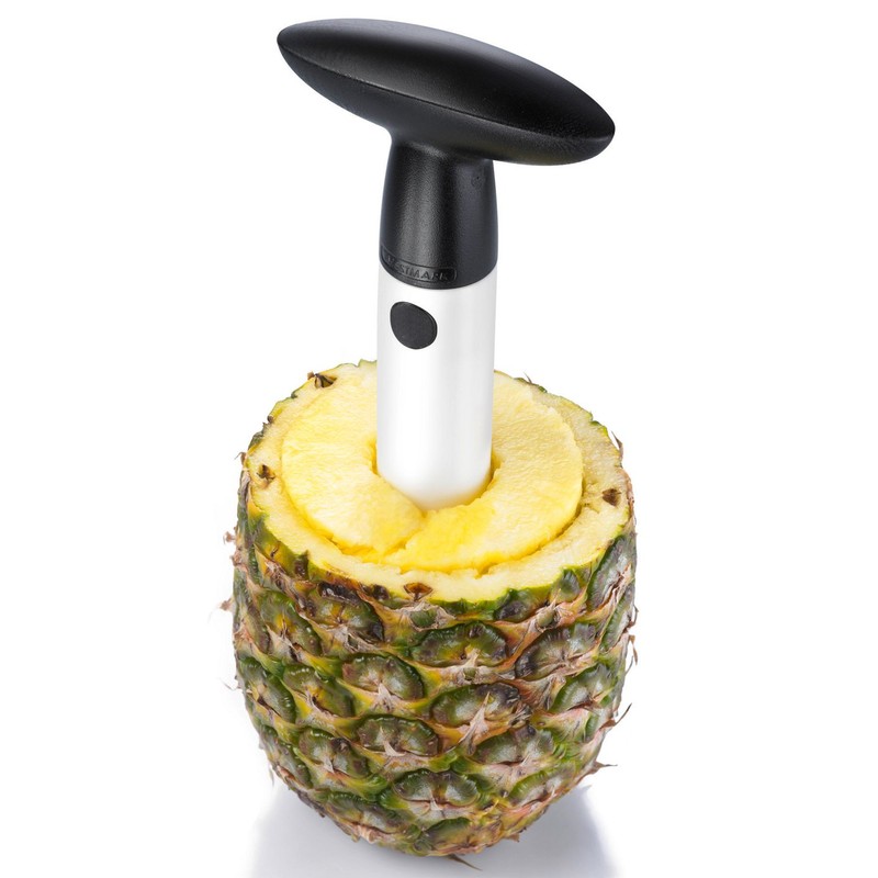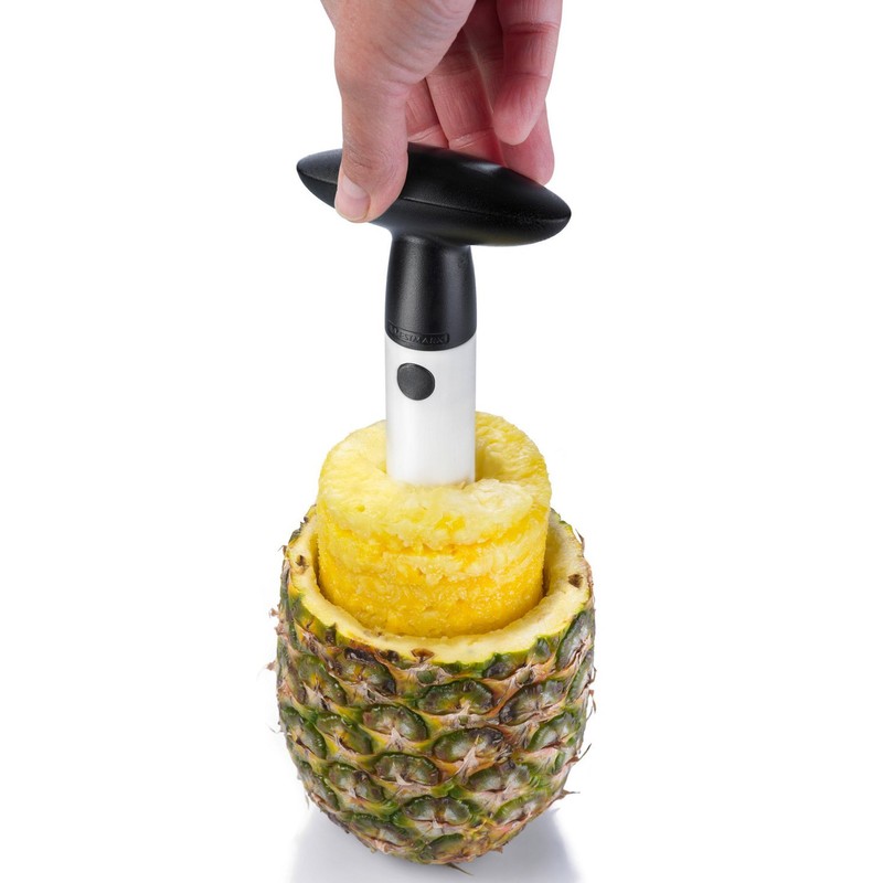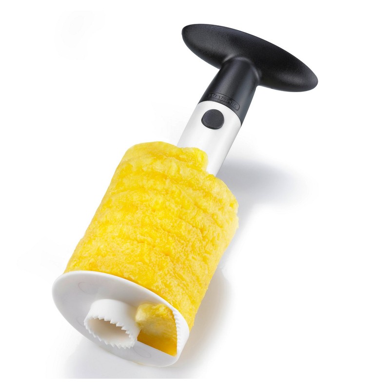 - Rounded ergonomically shaped handle for good grip when screwing in, removable via a push button for easy pushing the pineapple from the cutter and removing the stalk from the core of the cutter