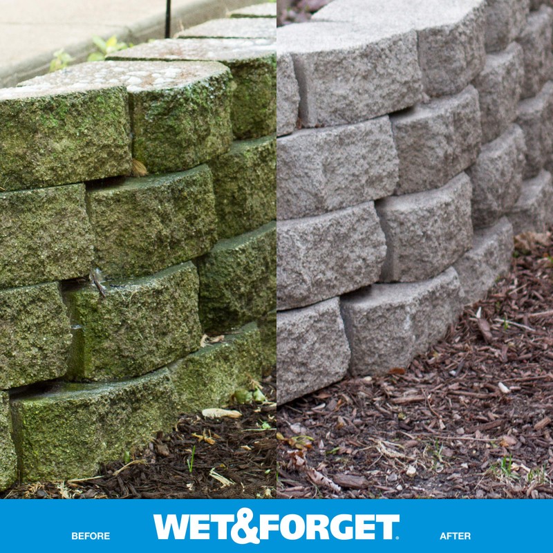 - Wet & Forget Concentrate Outdoor Cleaner removes green and black stains caused by moss, mold, mildew, and algae, no scrubbing, no rinsing, no pressure washing, just wet it and forget it on multiple surfaces including driveway, patio, roof, siding, deck, vinyl, wood, concrete, canvas, aluminum, and upholstery
