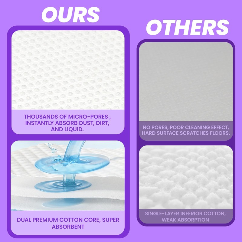 - Deep Cleaning with Strong Absorption - Our 50-pack Wet jet pads refills feature advanced Absorb + Lock design. Thousands of water-absorbing micro-pores of the pad surface quickly soak up liquid while trapping dust, dirt, and pet hair. The dual premium cotton core delivers 2X absorption power, locking in spills and moisture for spotless, streak-free floors