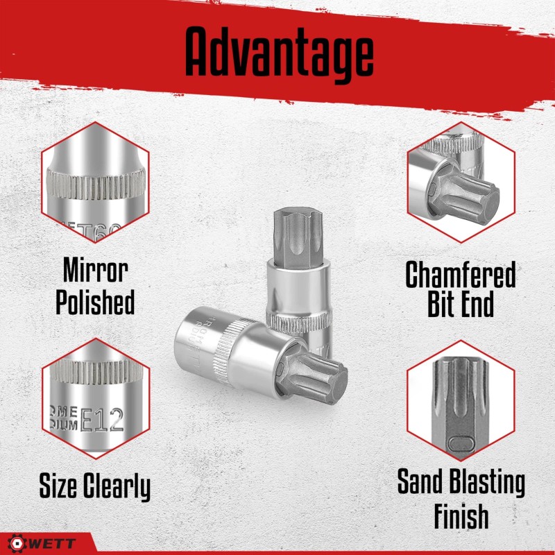 Advantage: The tip of the torx bit is precision machined, mirror chrome plated surface and laser precise dimensions, to help you quickly find the required size