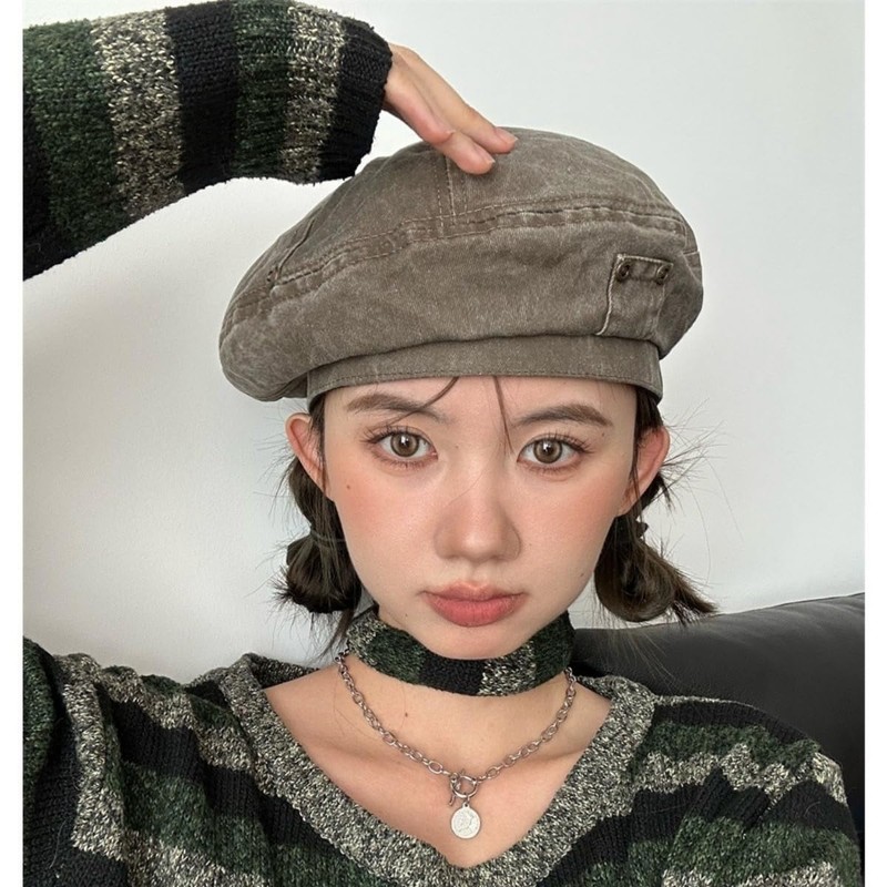 Weuiean JNH-071 Denim Beret Women's Hat, Retro Painter Hat, Adjustable Size, coffee