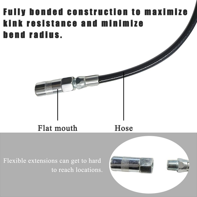 - 【Premium Material】: This flexible grease gun hose is made of excellent resin and metal. The hose made of resin is very flexible and can be bent and folded at will, which can maximize the kink resistance and minimize the bending radius. The nozzle made of metal is strong and wear-resistant, not easy to break. Therefore, with it, you can utilize it repeatedly for a long time.