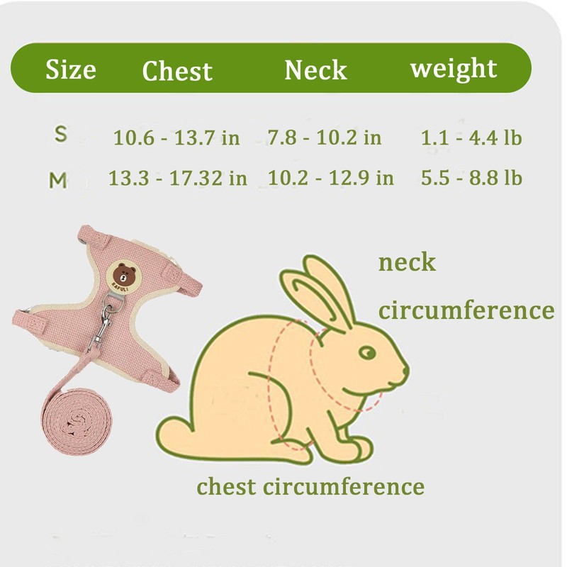 - 【Size Range】S: neck circumference: 7.8 "-10.2", chest circumference: 10.6 "-13.7", M: neck circumference: 10.2 "-12.9", chest circumference: 13.3 "-17.32". Suitable for small and medium-sized pets such as rabbits, guinea pigs, hedgehogs, chinchillas, and other small pets. The length of the towing rope is 47 inches. It allows your rabbit or other small animals to move freely without restrictions and without feeling hindered.