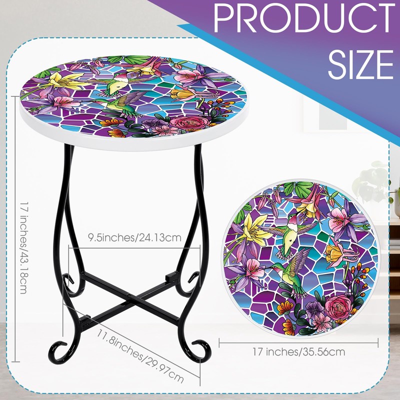 - Elegant Hummingbird Artwork: adorned with a vibrant hummingbird motif, this round mosaic side table adds a touch of nature inspired elegance to any space; The vivid colors and intricate patterns elevate your decor, blending seamlessly with both modern and traditional styles