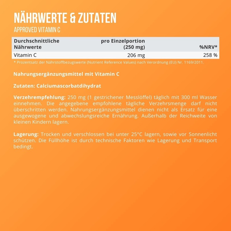 - Easy to take with dosing spoon - for exact and effective intake, a dosing spoon is included. Dissolve and drink a coated spoon of 250 mg calcium ascorbate powder daily in water or a drink (e.g. fruit juice) of your choice.