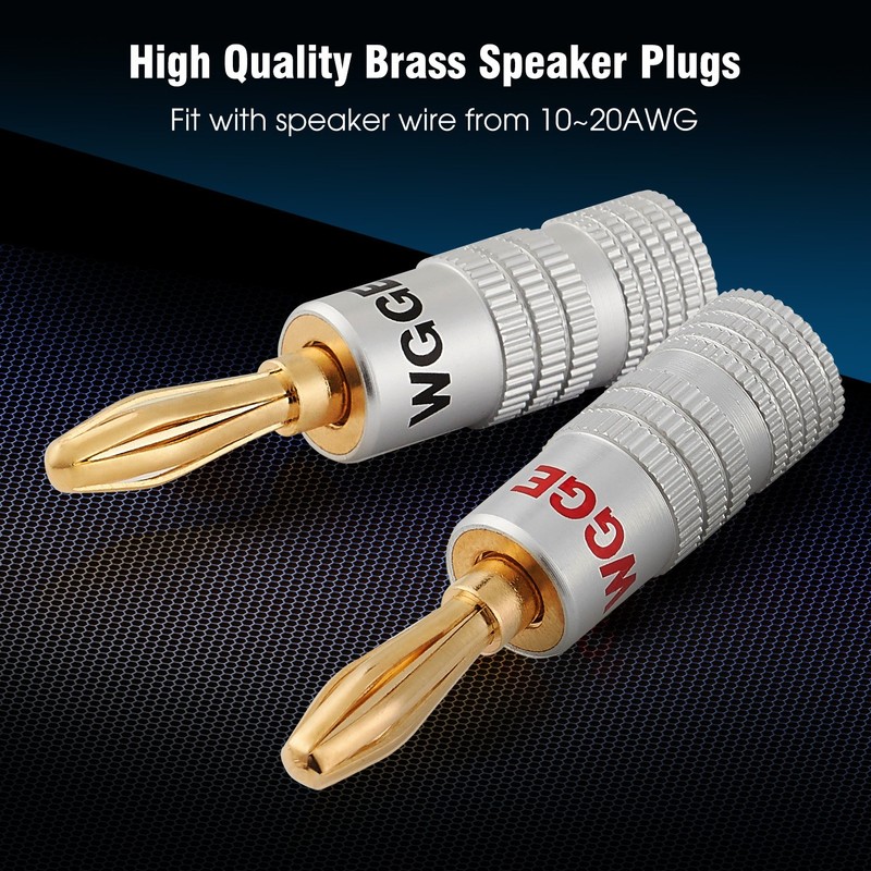 WGGE Banana Plugs Audio Jack Connector, 24k Gold Dual Screw Lock Speaker Connector for a lifetime of use, with a crystal clear signal.Double screws, when properly fastened, are said to be as effective as soldering, but clearly with much less hassle.Pure Copper, gold plated, Pure copper made, non-magnetic. Accepts wire size up to 4mm. Accepts 12AWG to 18AWG speaker wire.Double screws locking, no soldering. High quality.W&G Global Electronics Inc. mainly produce Test lead with Alligator Clips, HDMI Cables, Banana Plugs, Wire Strippers and so on. We only provided high quality and good price products to each customer.