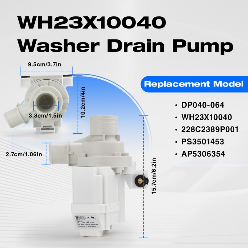 - REPLACEMENT PART: WH23X10040 DP040-064 drain pump replaces 228C2389P001 PS3501453 AP5306354 water drain pump. If you're not sure if it's what you need, provide your machine model number and we'll be happy to check for you