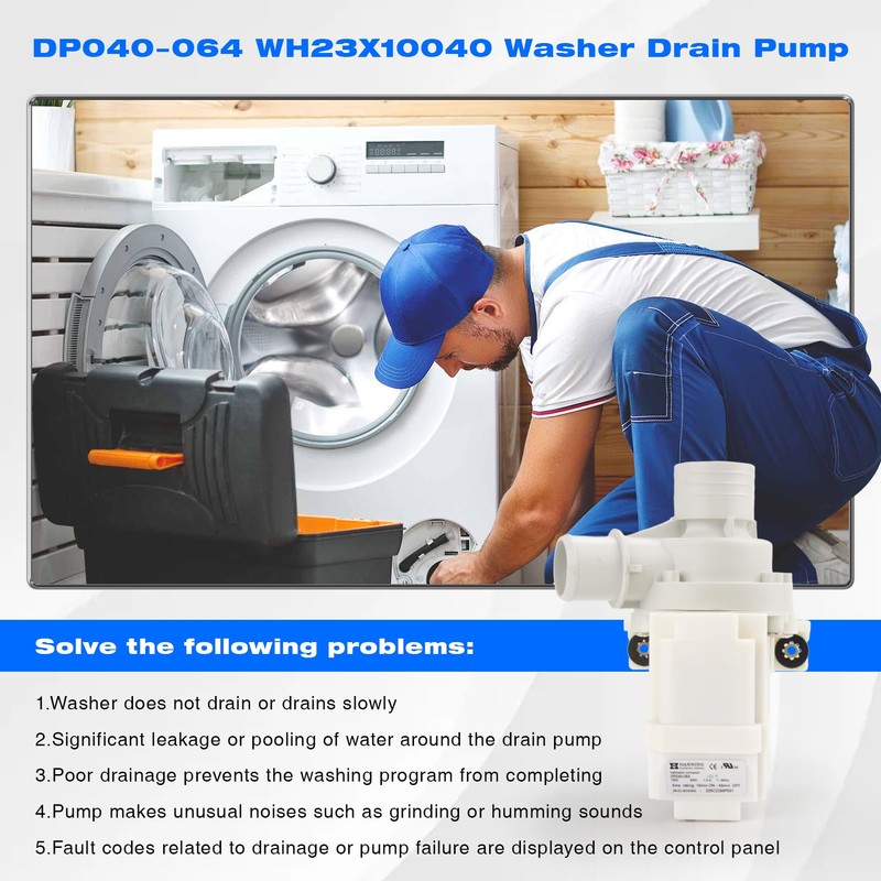 - FUNCTION OF WH23X10040 DP040-064 DRAIN PUMP: The WH23X10040 DP040-064 drain pump can help you if your washer has the following problems: 1. does not drain or drains slowly. 2. there is a visible leak or pooling of water around the drain pump. 3. you cannot complete the wash cycle due to poor draining. 4. the pump is making an unusual noise. 5. the control panel displays an error code related to a drain or pump malfunction