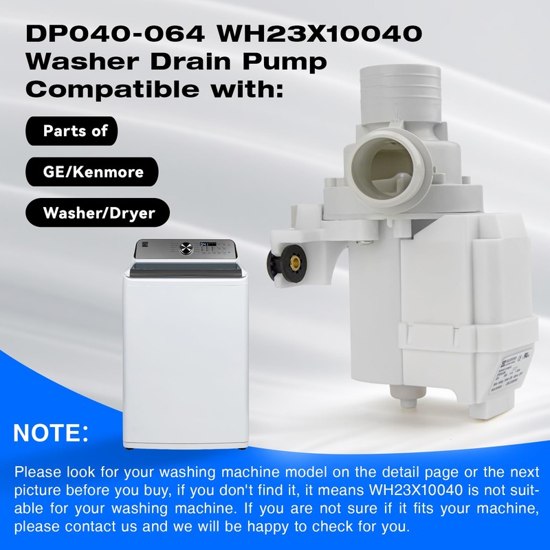 - SUITABLE MACHINE: WH23X10040 DP040-064 drain pump is compatible with parts of GE/Kenmore Washer/Dryer. There is a full list of machine models on the details page, please check to make sure your machine is listed before purchasing or it won't work for you