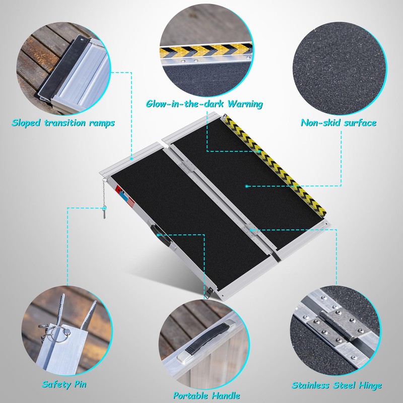 - Anti-slip: Our aluminum ramps feature a jagged texture surface that helps prevent slips and falls, even in wet or slippery conditions. We also include an anti-slip mat under the ramp transition plate for added safety. You can use our wheel chair ramps with confidence, knowing that you'll be able to maintain traction and control.