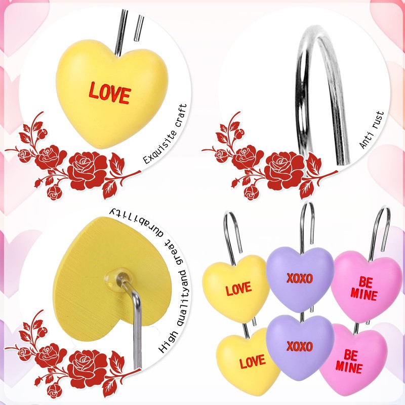 - Valentine's Day Conversation Heart Design - These shower curtain hooks are Valentine’s Day themed and come in pink, purple and yellow heart shapes, bright and colorful design making it suitable for creating warm and joyful atmosphere for your home and party.
