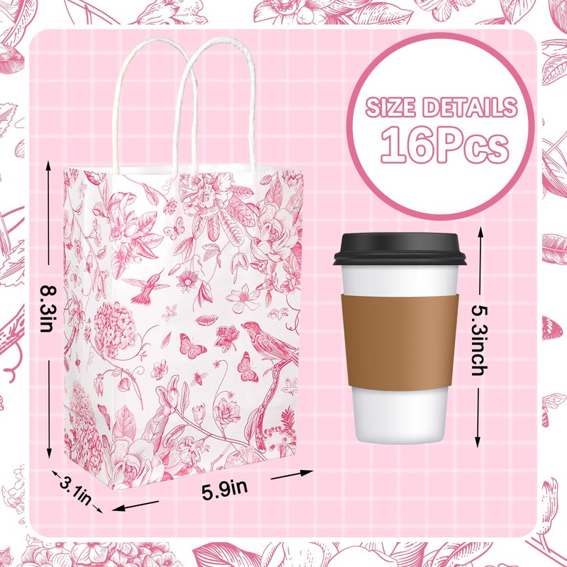 Whaline 16Pcs Floral Bird Paper Gift Bag Pink White Flower Party Favor Bag With Handle Decorative Goodie Candy Treat Bag For Party Supplies, 5.9 x 8.3 x 3.1 Inch