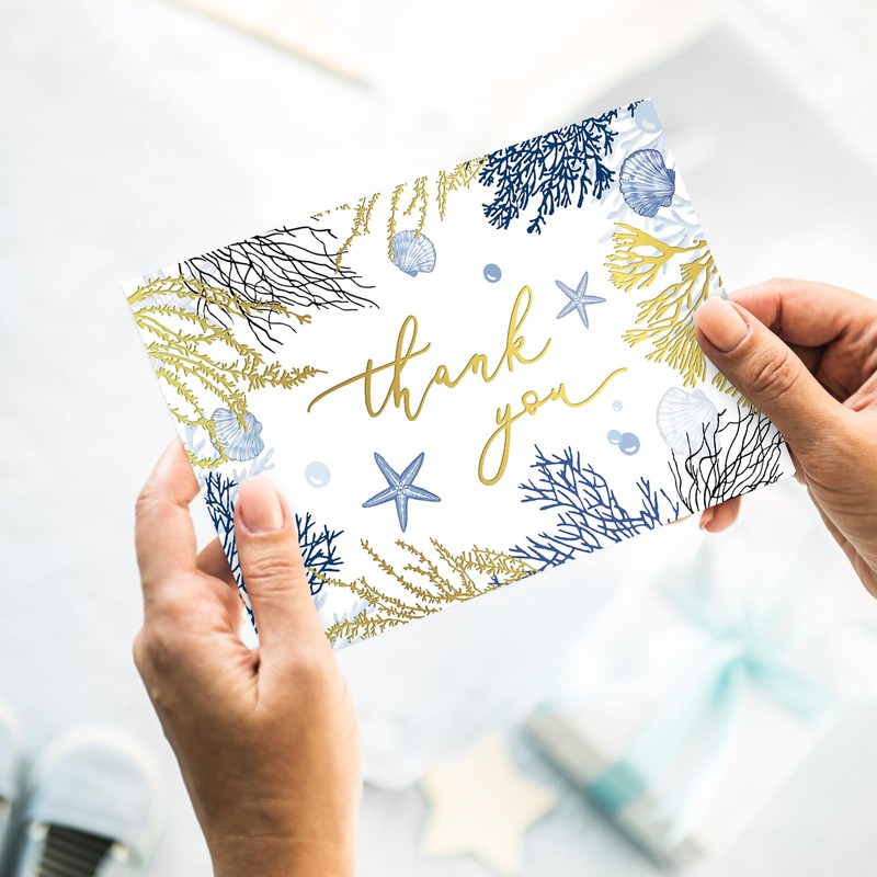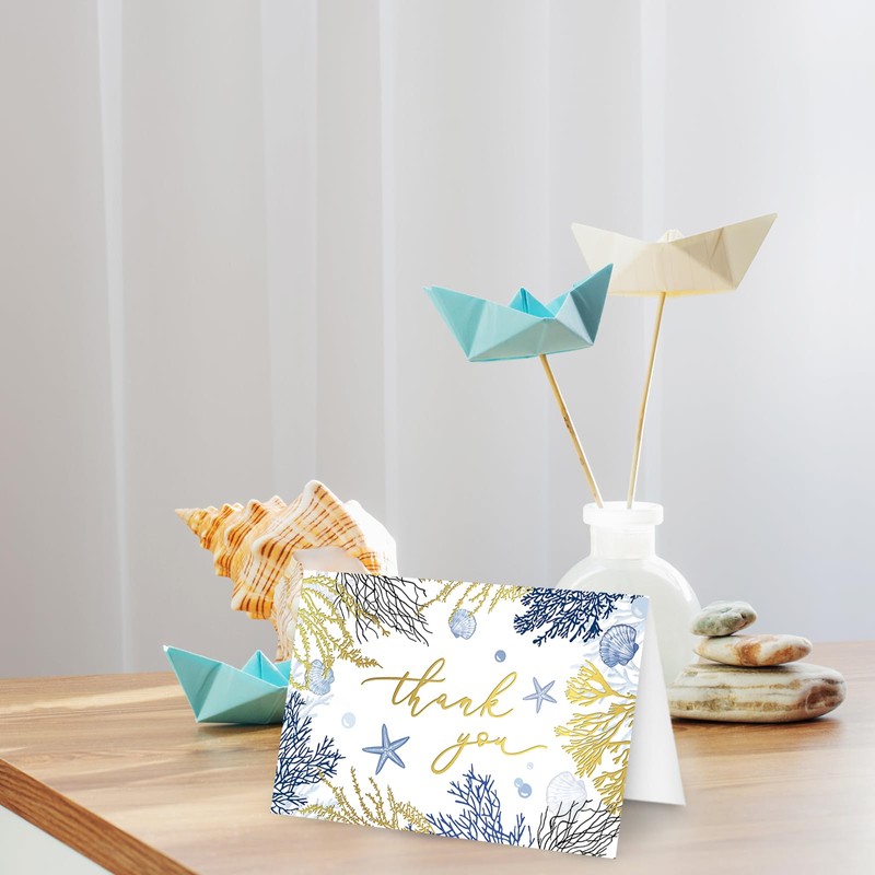 - Delicate Design: Featuring coastal beach theme, patterned with blue starfishes, seashells and gold foil corals, and printed with the gold foil words of thank you, elegant and exquisite, great for you to express your gratitude