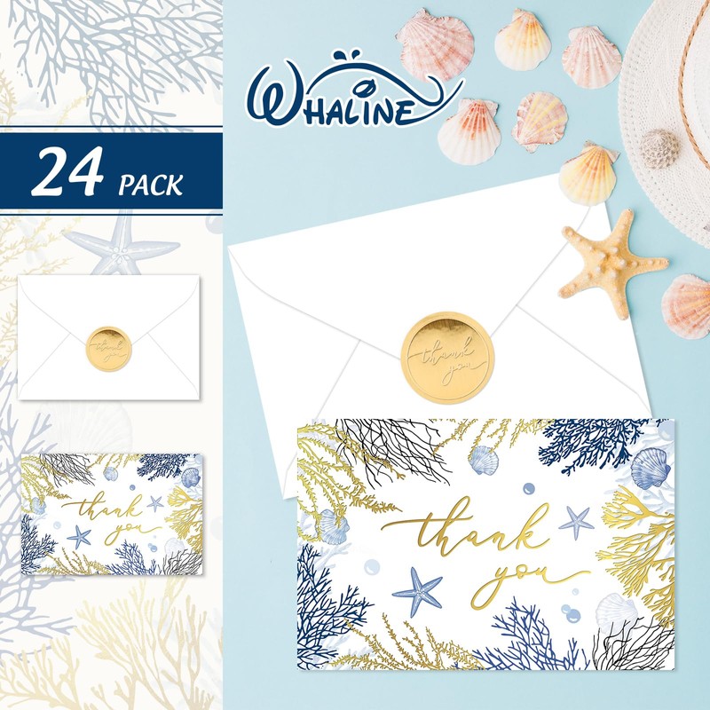 Whaline 24 Pack Ocean Thank You Cards Gold Foil Blue Coral Greeting Cards with Envelopes Stickers Blank Note Cards for Coastal Beach Birthday Baby Shower Party Supplies, 4 x 6 Inch