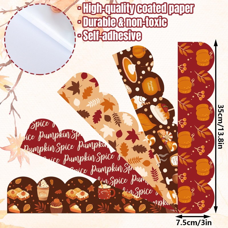 - Fall Theme - The bulletin borders match fall theme design, printed with maple leaves, pumpkin, drinks, dessert, etc., and use classic fall colors, well add a strong seasonal atmosphere.